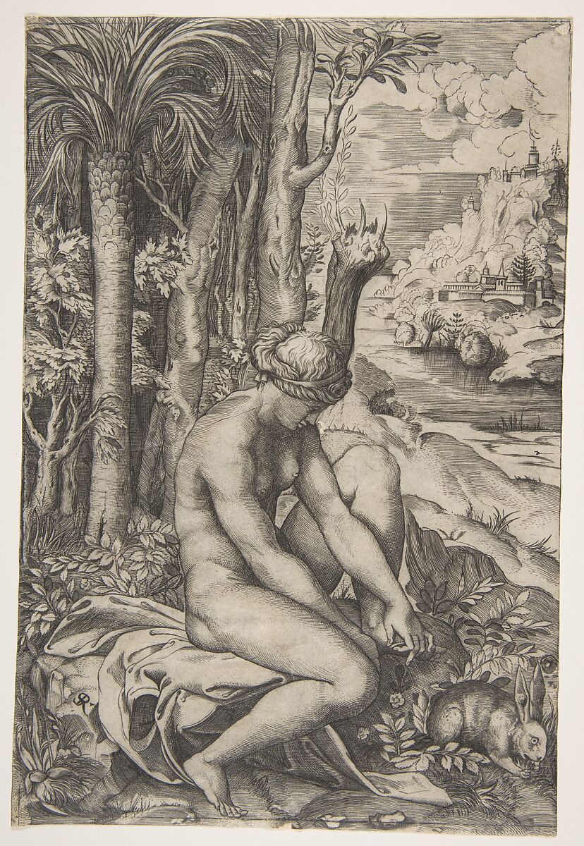 Venus removing a thorn from her left foot while seated beside trees and foliage, a hare eating grass before her