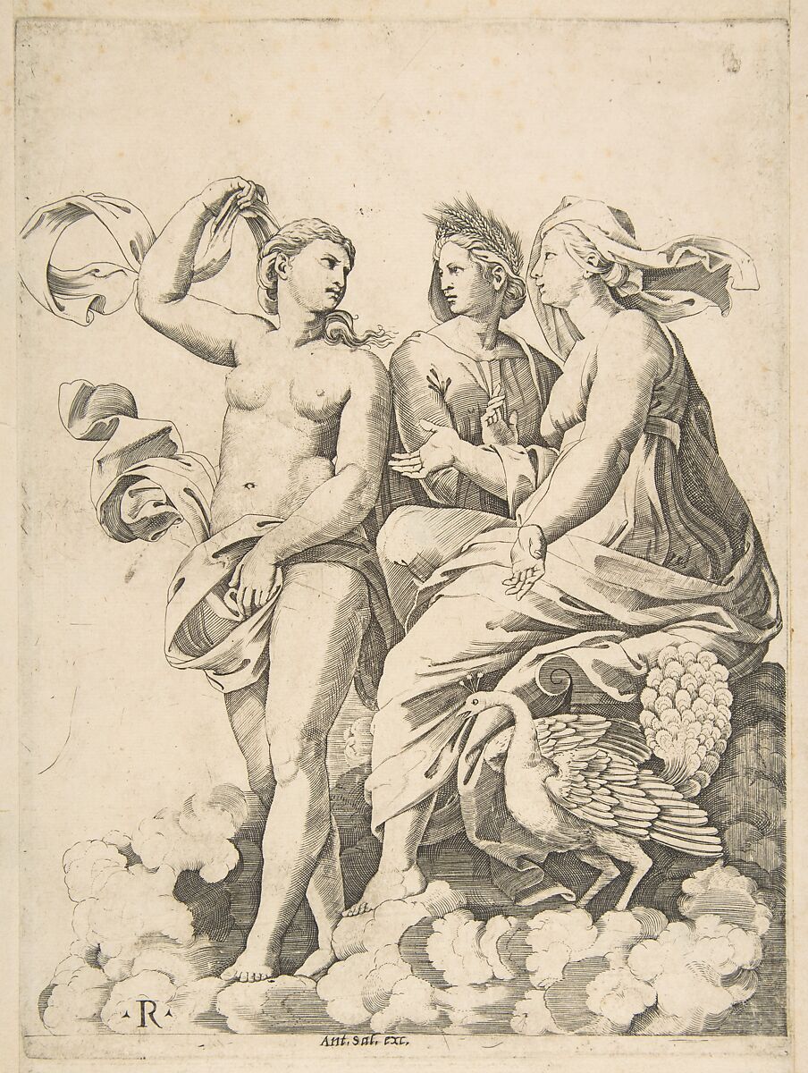 - Title: Juno, Ceres, and Psyche in the clouds conversing, Juno seated with a peacock at her feet, Ceres wearing a garland of wheat and Psyche partially naked and holding a cloth