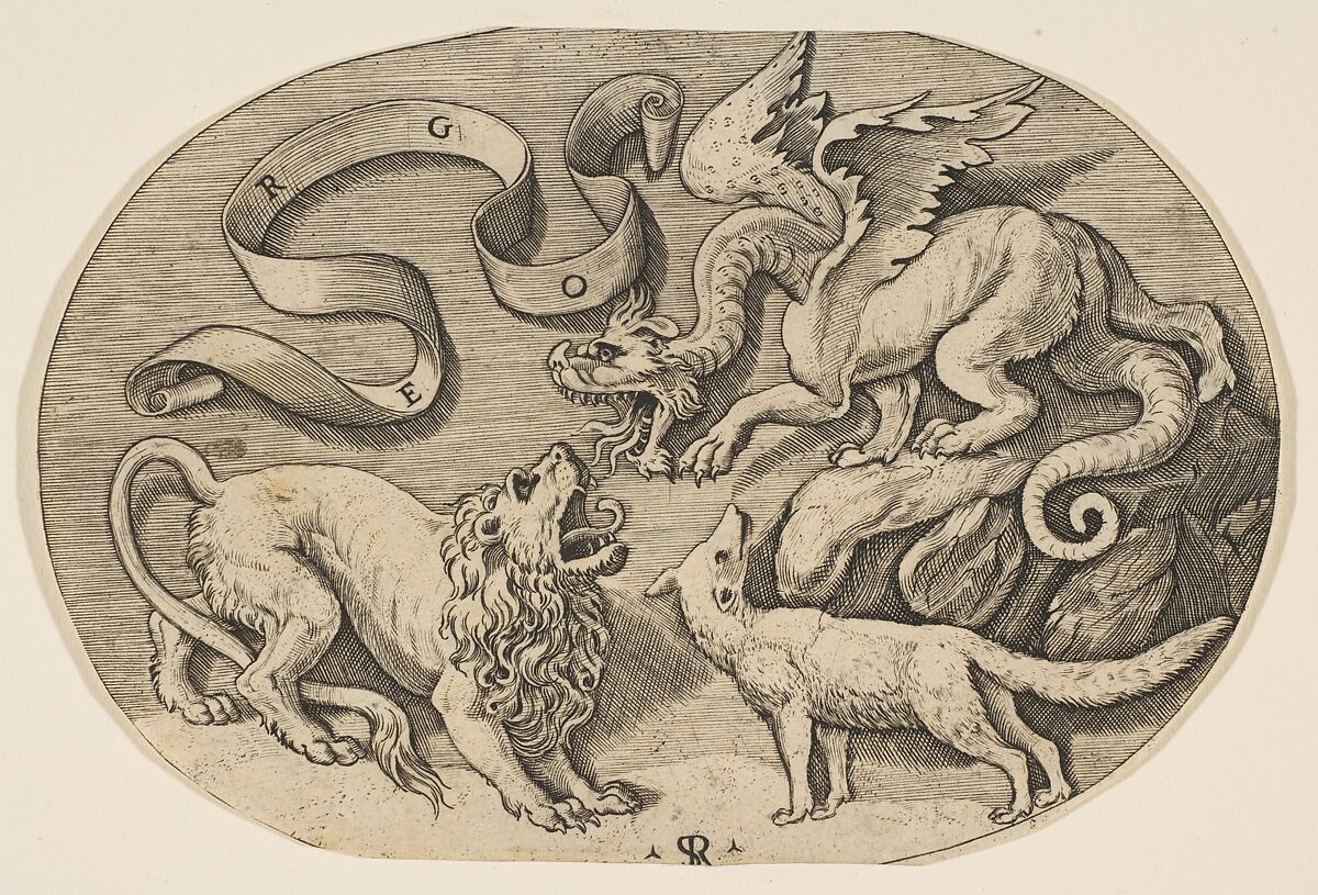A lion, dragon and fox fighting each other, an inscribed banderole above, an oval composition