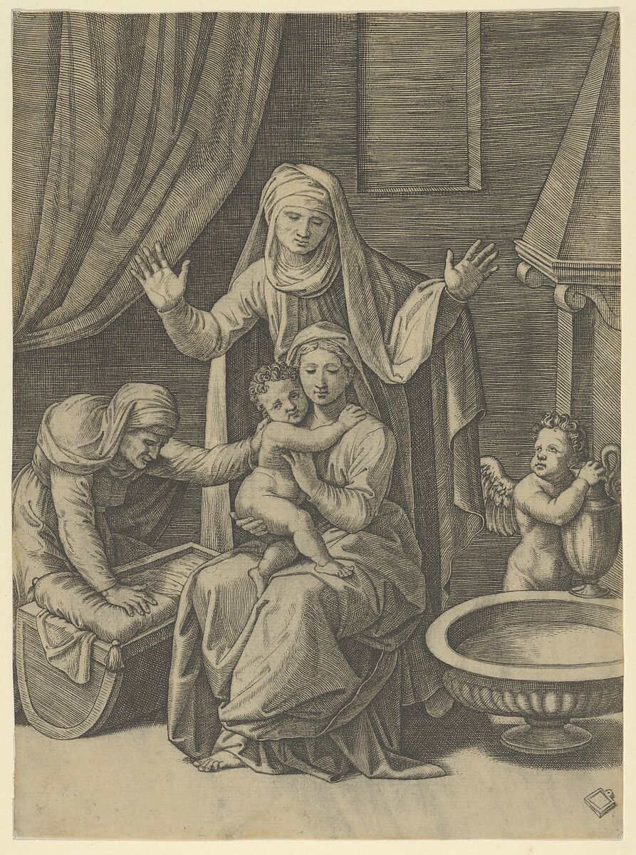 - Title:The Virgin holding the Christ Child, St Anne standing above with arms outstretched, St Elizabeth at the left