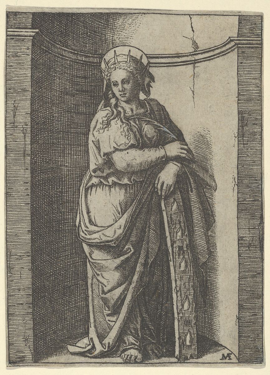 - Title:Saint Catherine standing in a niche, resting on a wheel, her instrument of torture