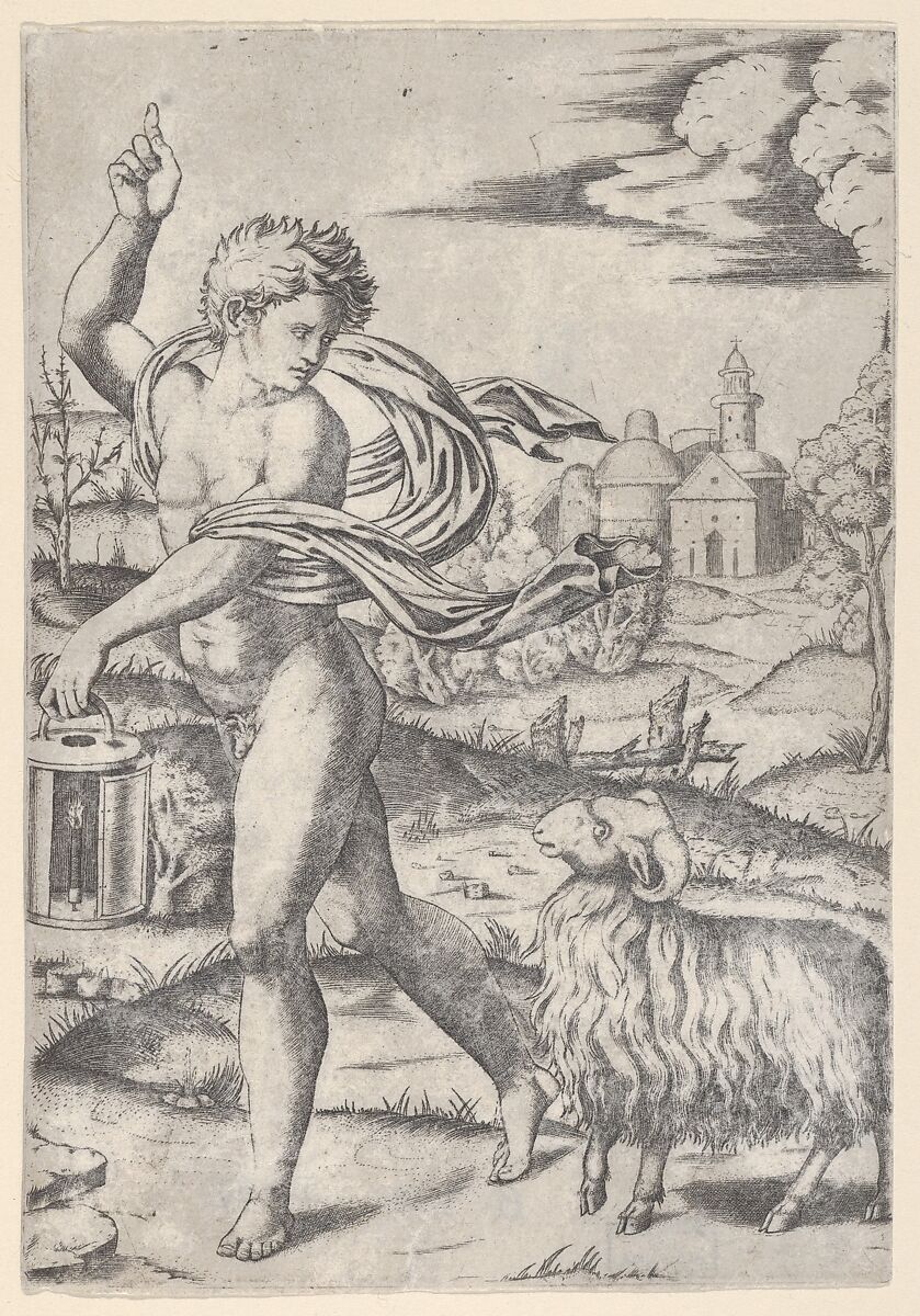 - Title:A naked young man walking left, carrying a lantern and looking backwards over his shoulder at a ram