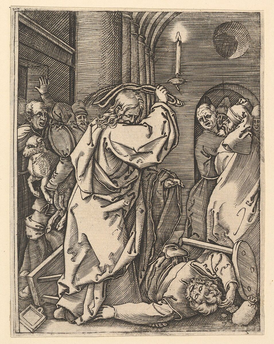 - Title: The Cleansing of the Temple; Christ driving the money-changers from the temple and raising a scourge over his left shoulder, as if to strike a man on the floor, from "The Passion of Christ"