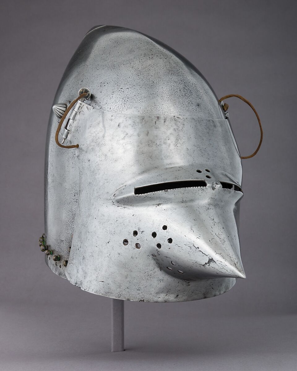 - Dimensions:Bascinet (a); H. 10 in. (25.4 cm); W. 8 1/8 in. (20.6 cm); D. 13 1/2 in. (34.3 cm); Wt. 5 lb. 3.7 oz. (2372.9 g); aventail (b); H. 16 1/4 in. (41.3 cm); Wt. 2 lb. 14.4 oz. (1315.4 g)