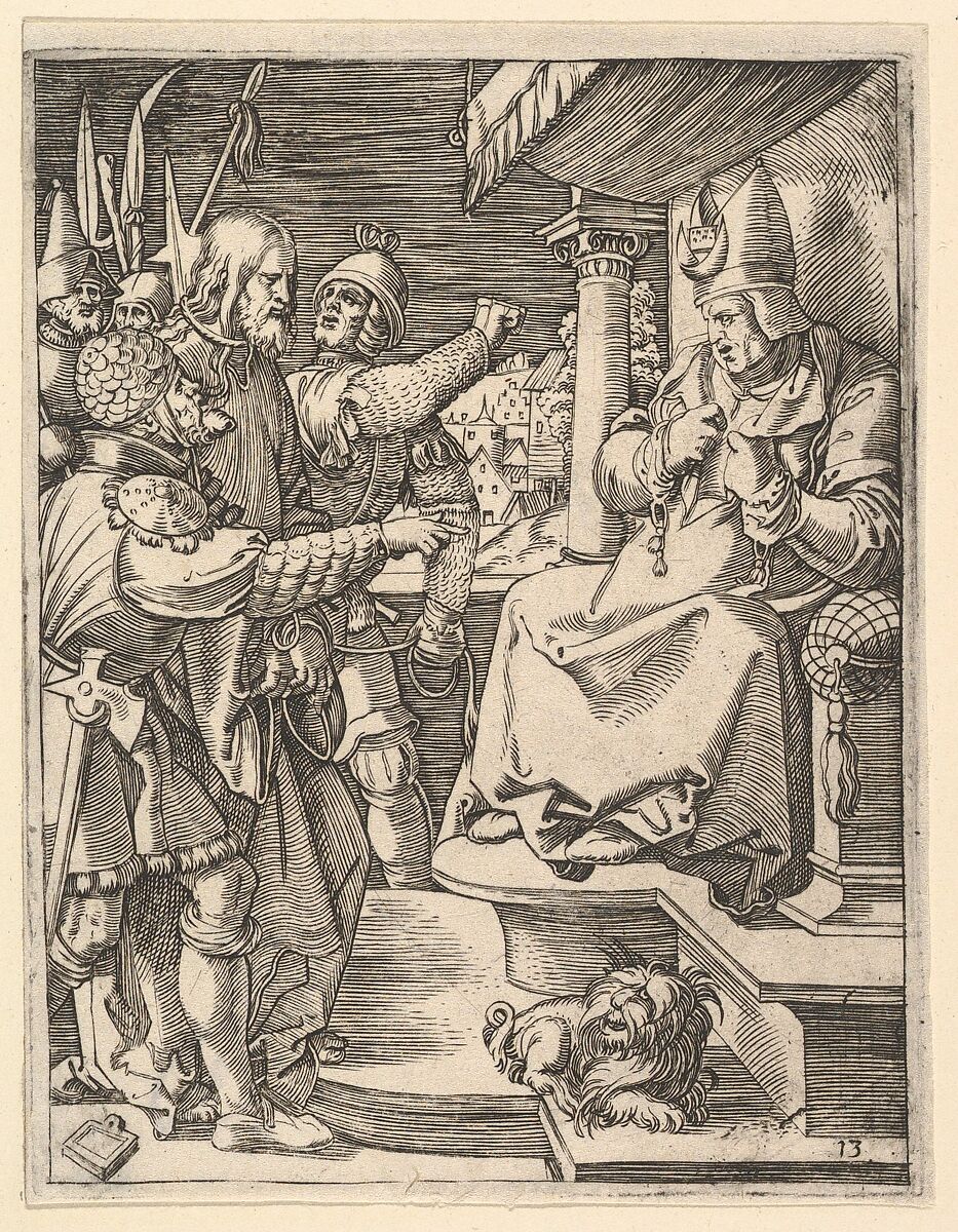 - Title:Christ before Caiaphas: soldiers present Christ to seated hight priest who tears his garments, from "The Passion of Christ", after Dürer