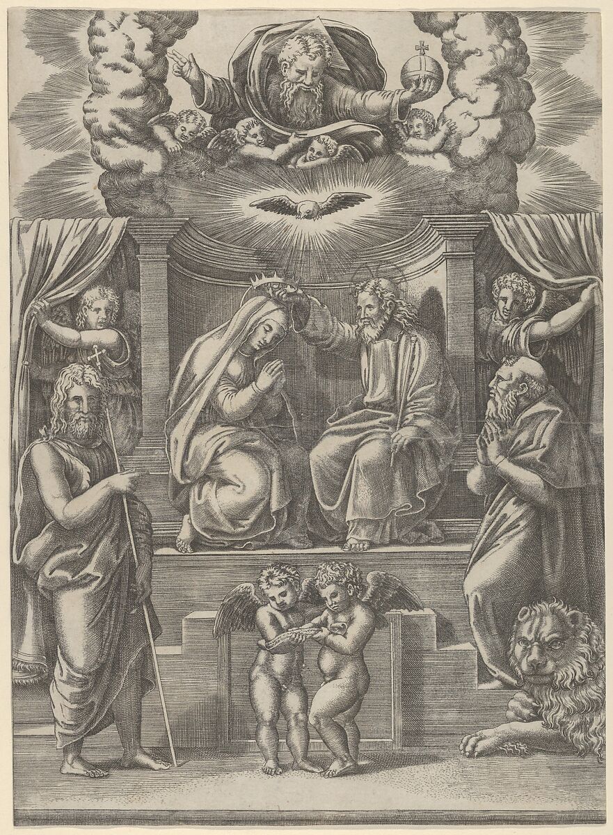 - Title: The coronation of the Virgin, God the Father above, St Jerome lower right and St John the Baptist lower left