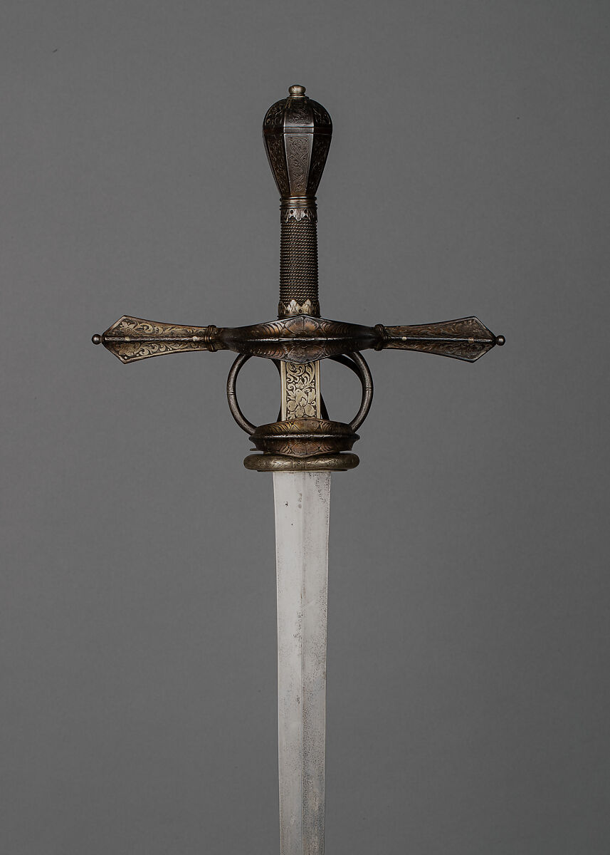 The rapier was the principal civilian sidearm throughout the sixteenth and seventeenth centuries. Designed for cut-and-thrust fencing of progressively complex techniques, the rapier is characterized by a double-edged blade with an acute point and an elaborate guard for the hand. The guards, usually of iron or steel, were subject to a variety of embellishment. They were engraved, chiseled, gilded, damascened, and encrusted in gold and silver in keeping with fashionable styles.