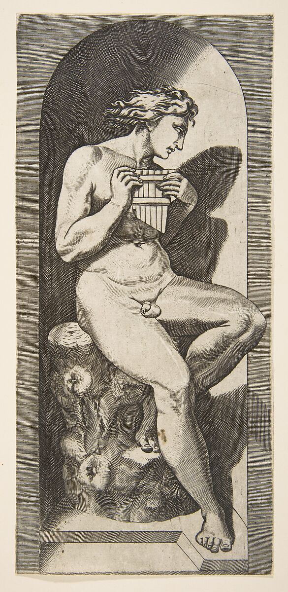 - Title: Olympus naked seated on a tree stump holding pipes, set within a niche
