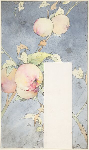 Habert-Dys’s designs reflect both the nineteenth-century fascination with Japanese art and the prevailing aesthetic of Art Nouveau. This watercolor was probably a design for a book illustration, perhaps a title page. The composition balances the plump fruit with the delicate network of spider webs, as five spiders industriously fill the spaces between the branches with geometric patterns.