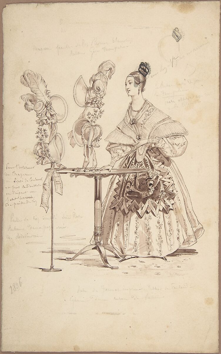 Drawing with a woman dressed with a full-skirted dress with puff sleeves and layered, pleated collar, and featuring floral motifs, worn with an apron with semi-abstract motifs tied around the waist, standing behind a round table, around which stand several hats, with elaborate designs adorned with feathers, bundles of flowers and leaves, and ribbons, featuring the fashionable styles of the time.