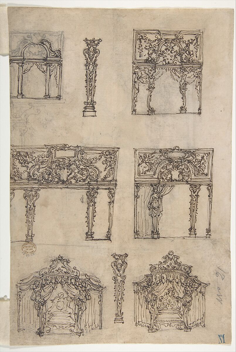 - Title:Designs for Archways and Baldachins with Caryatids and Coats of Arms (recto); Design for a Monument with Statues of Prudence and Fortitude (verso)