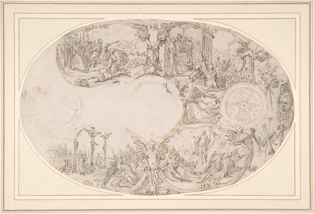 This design for an oval dish beautifully illustrates that Paulus van Vianen was not only a goldsmith, but also an excellent designer and draftsman. The dish has a religious theme with four compartments containing scenes from the Passion of Christ. From left to right and top to bottom are depicted: The Capture of Christ; Ecce Homo; The Crucifixion; The Resurrection. Van Vianen has further decorated the dish with angels, cherubs and trophies containing the so-called Arma Christi. Where parts have been left empty on the left side, we can assume Van Vianen intended a repetition of those motifs seen on the right. Unknown is what was to be depicted in the center of the dish.