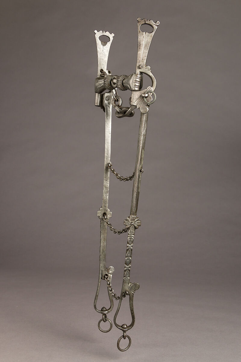 This bit was used for the training of young horses and starting them with the curb bit. Despite their impressive aspect, the straight elongated shanks were in fact thought to be more gentle on the horse, because of the longer reaction time in their leverage effect and the fact that they were stopped by the horse's chest at some point. Curb bits were also used with a very light hand, the well-trained horses responding by anticipation to the slightest move of the reins.