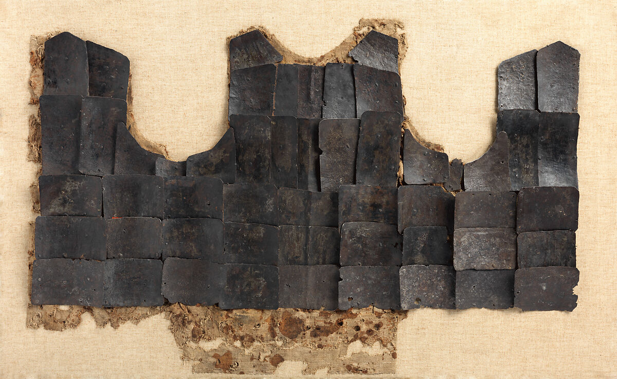 This is part of a large find of medieval armor discovered in 1840 in the ruins of the fortress of Chalcis, on the Greek island of Euboea (then a Venetian colony called Negroponte). The fortress had been captured and destroyed by the Turks in 1470. Now divided largely between the Ethnological Museum, Athens, and The Metropolitan Museum of Art, the Chalcis hoard contains many rare and unusual elements of fourteenth- and fifteenth-century armor. Of particular importance are the variety of headpieces and the many fragments of brigandines (armor for the torso constructed of small plates riveted to layers of fabric), some of which retain portions of their original velvet covering. The Chalcis armor provides a unique picture of the armament used in the Aegean, one of the easternmost military outposts of the Venetian empire.
