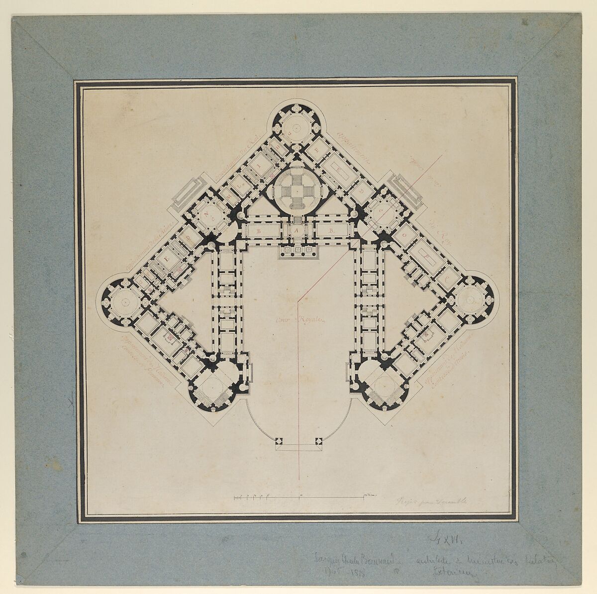 While identified by the inscriptions on this drawing as a plan for the royal castle at Versailles, this drawing represents an unexecuted renovation plan for the Château de Rambouillet. It was proposed to King Louis XVI by the architect Jean Augustin Renard at the end of 1783. Renard faced the difficult task of transforming the existing building, which was deemed too Gothic in taste, into a modern residence that could function as Royal residence and hunting lodge. King Louis XVI ultimately deemed the project too expensive and dismissed Renard's plans. While other works on the grounds took place in the following years under supervision of the architect Jean Jacques Thévenin, the main building was not worked on until Napoleon tore down the East wing, and had the interiors renovated.