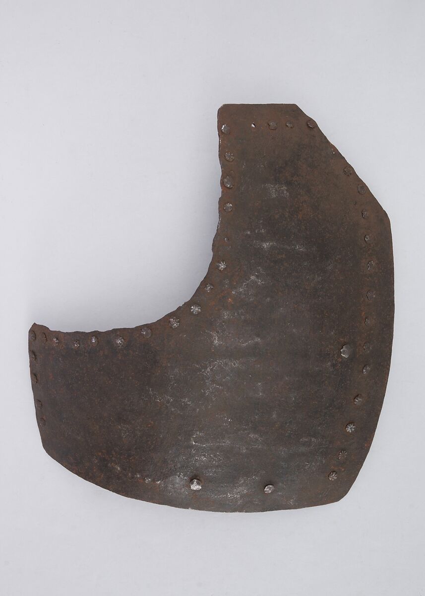 This is part of a large find of medieval armor discovered in 1840 in the ruins of the fortress of Chalcis, on the Greek island of Euboea (then a Venetian colony called Negroponte). The fortress had been captured and destroyed by the Turks in 1470. Now divided largely between the Ethnological Museum, Athens, and The Metropolitan Museum of Art, the Chalcis hoard contains many rare and unusual elements of fourteenth- and fifteenth-century armor. Of particular importance are the variety of headpieces and the many fragments of brigandines (armor for the torso constructed of small plates riveted to layers of fabric), some of which retain portions of their original velvet covering. The Chalcis armor provides a unique picture of the armament used in the Aegean, one of the easternmost military outposts of the Venetian empire.
