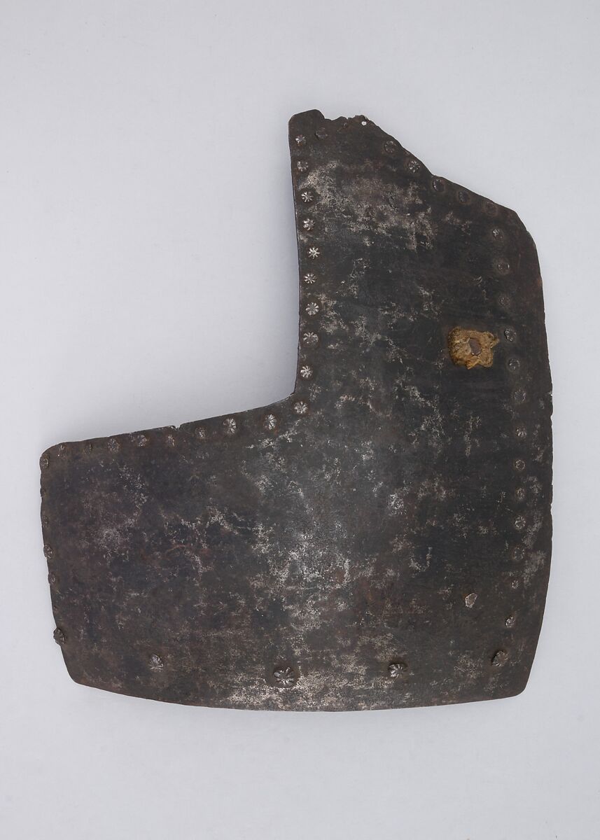 This is part of a large find of medieval armor discovered in 1840 in the ruins of the fortress of Chalcis, on the Greek island of Euboea (then a Venetian colony called Negroponte). The fortress had been captured and destroyed by the Turks in 1470. Now divided largely between the Ethnological Museum, Athens, and The Metropolitan Museum of Art, the Chalcis hoard contains many rare and unusual elements of fourteenth- and fifteenth-century armor. Of particular importance are the variety of headpieces and the many fragments of brigandines (armor for the torso constructed of small plates riveted to layers of fabric), some of which retain portions of their original velvet covering. The Chalcis armor provides a unique picture of the armament used in the Aegean, one of the easternmost military outposts of the Venetian empire.