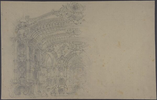 - Title: Stage Set Design; Left Half of Elaborate Baroque-Rococo Style Proscenium Opening (recto); Several Sketches of Name Plaques and Wreaths, framed by Swags, with names "Verdi" and "Aida" (verso)