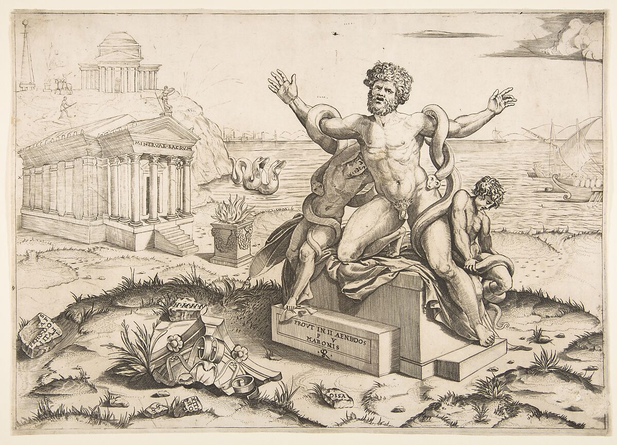 - Title: Laocoön and his two sons being attacked by serpents upon a pedestal, a temple to Minerva behind them, another temple and the sea in the background