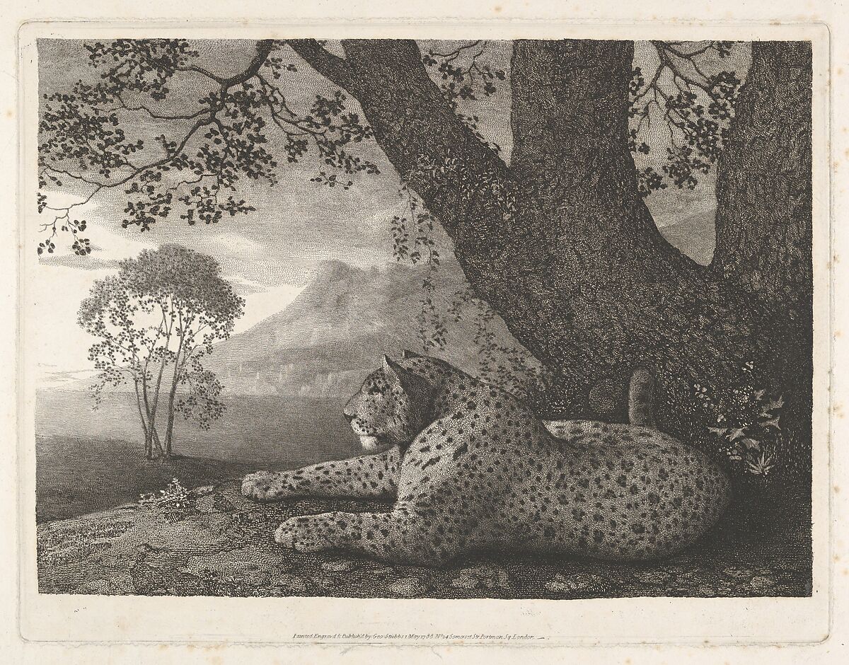Stubbs actually titled this print "A Tyger," the inclusive late-eighteenth century term for tigers, cheetahs, and leopards. After studying the animal in an English menagerie, he placed it in an expansive, light-saturated landscape. The artist etched the plate himself, using roulette work to evoke the distant haze and to draw evocative visual connections between the spotted patterns of fur, bark, rocks, and speckled overhanging leaves.