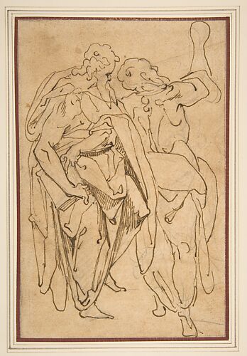 This powerfully rendered composition portrays an allegory of the Tuscan towns of San Gimignano and Colle Val d'Elsa, which came under Florentine rule in 1354 and 1333 respectively. The drawing is connected with a precisely documented, historically significant painting, and this helps in deciphering the otherwise abstruse iconography. A muscular old river god alluding to the Elsa River sits in the foreground, flanked by two emblematic male figures holding the banners of the two towns. At left the banner would eventually depict the lion of San Gimignano, and at right the banner would eventually depict the horse's head of Colle. The distant background includes roving views of the fortified towns, and in the final work the town furthest in the distance would include the numerous tall towers that would characterize it as San Gimignano. As can be deduced from the traces of proportional squaring, the carefully drawn sheet served as a demonstration drawing (modello), the penultimate step in the process of preliminary design of the painting before it was enlarged to full scale. The drawing technique, with firm rounded outlines and stark contrasts of white highlights and brown-gray wash shadows, is typical of the artist.