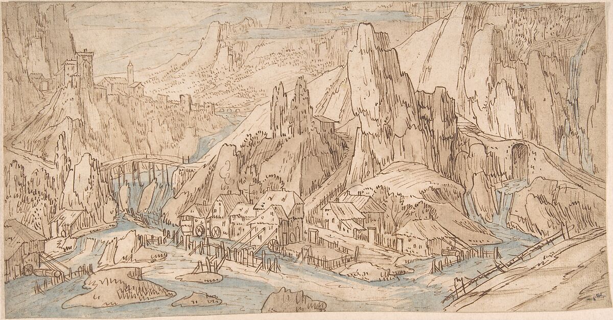 The landscape is executed in vigorous, broad pen strokes and loosely applied brown and blue washes. Verhaecht paid little attention to detail; note for example the four watermills, broadly sketched along the riverbanks. Trees, scattered around the landscape, are barely discernable from the fantastic rocks, as they are delineated in equally loose and elongated lines. The free execution of this drawing gives the impression that the artist worked at great speed. Possibly the sheet was intended as a compositional study for a painting. The formal language of this Mountain Valley is typical of the mannerism that characterized the early examples of Netherlandish landscape painting. High horizon and vast panoramic views are equally characteristic of sixteenth-century imagery.