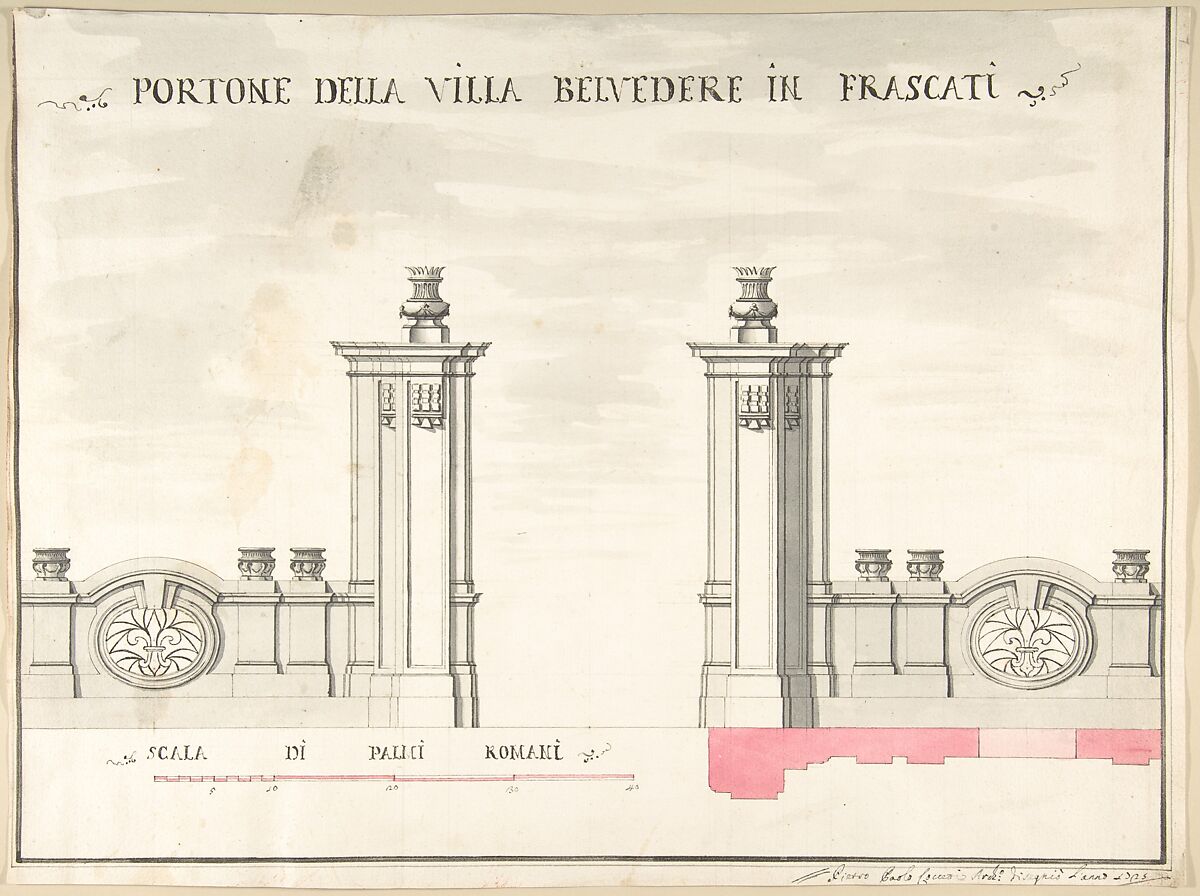 - Medium: Pen and dark brown ink, brush and gray and pink wash, over ruling in graphite
