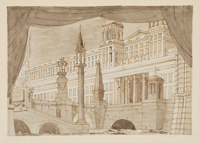 - Title: Design for a Stage Set: Solomon Receiving the Queen of Sheba under a Baldacchino, with Fantastical Architecture and a Gardenscape