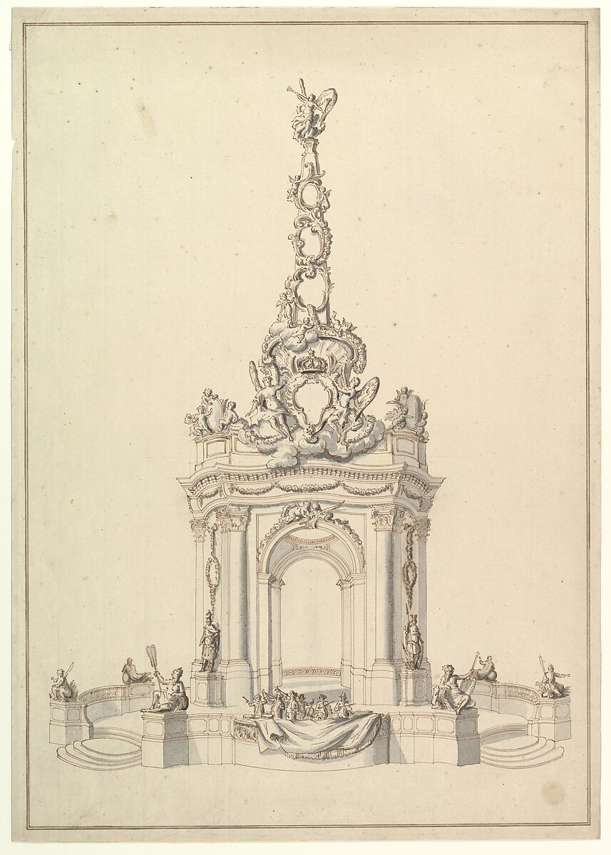 - Title: Design for a Festival Monument: Base Holds a Small Orchestra; Triumphal Arch Surmounted by a Cartouche-Decorated Pyramid with Figure of Fame, below, a Royal Crown