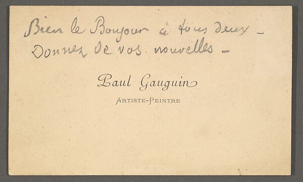 F. C. Schang donated 64 artists’ calling cards to The Met between 1977 and 1989. The calling cards are housed in an album that also includes Schang’s collection of stamps and other related ephemera. Calling cards derived from a custom, originating in England, in which messages were inscribed on the backs of playing cards. Cards made for the express purpose of sharing hand-written messages were manufactured beginning in the eighteenth century; by the early-nineteenth century, calling cards had become a popular means for sending well wishes, holiday greetings, condolences, and messages of courtship.