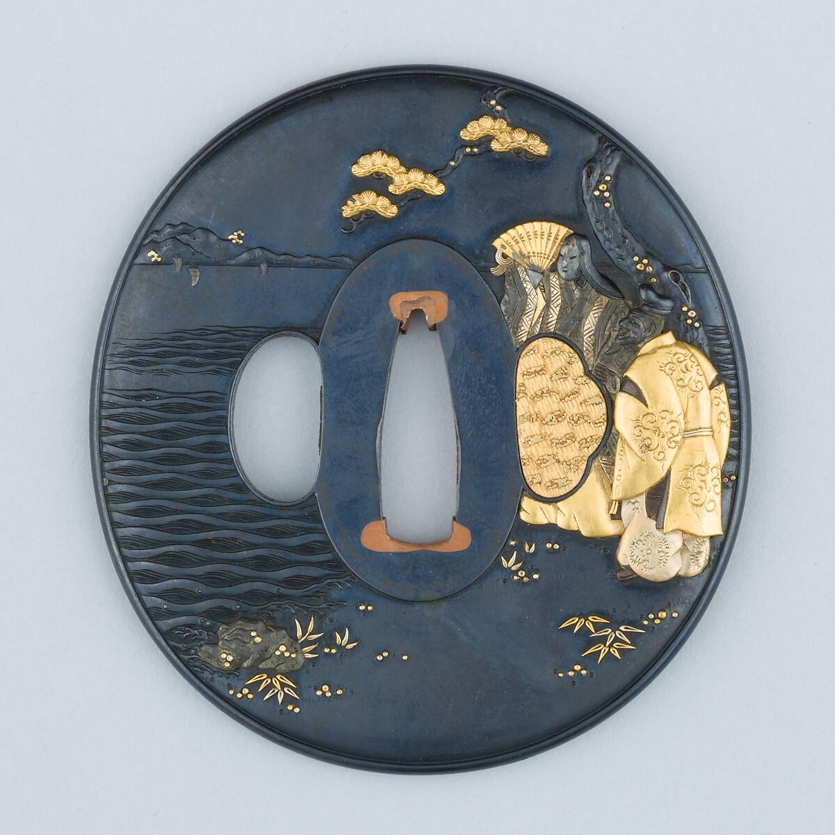 - Medium: Copper-gold alloy (shakudō), gold, silver, copper-silver alloy (shibuichi), copper