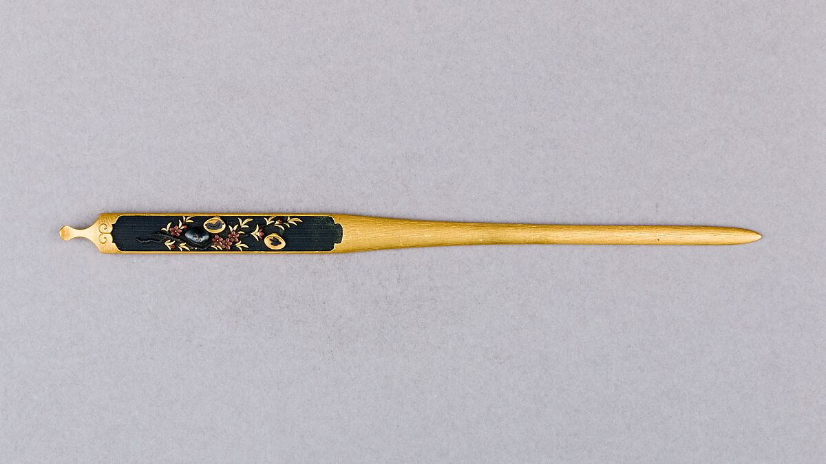 A kōgai is a hairdressing tool that is part of a sword mounting. The long slender implement is carried in a slot on the obverse of a katana scabbard, often with a matching kozuka (handle of a by-knife) in a slot on the reverse.