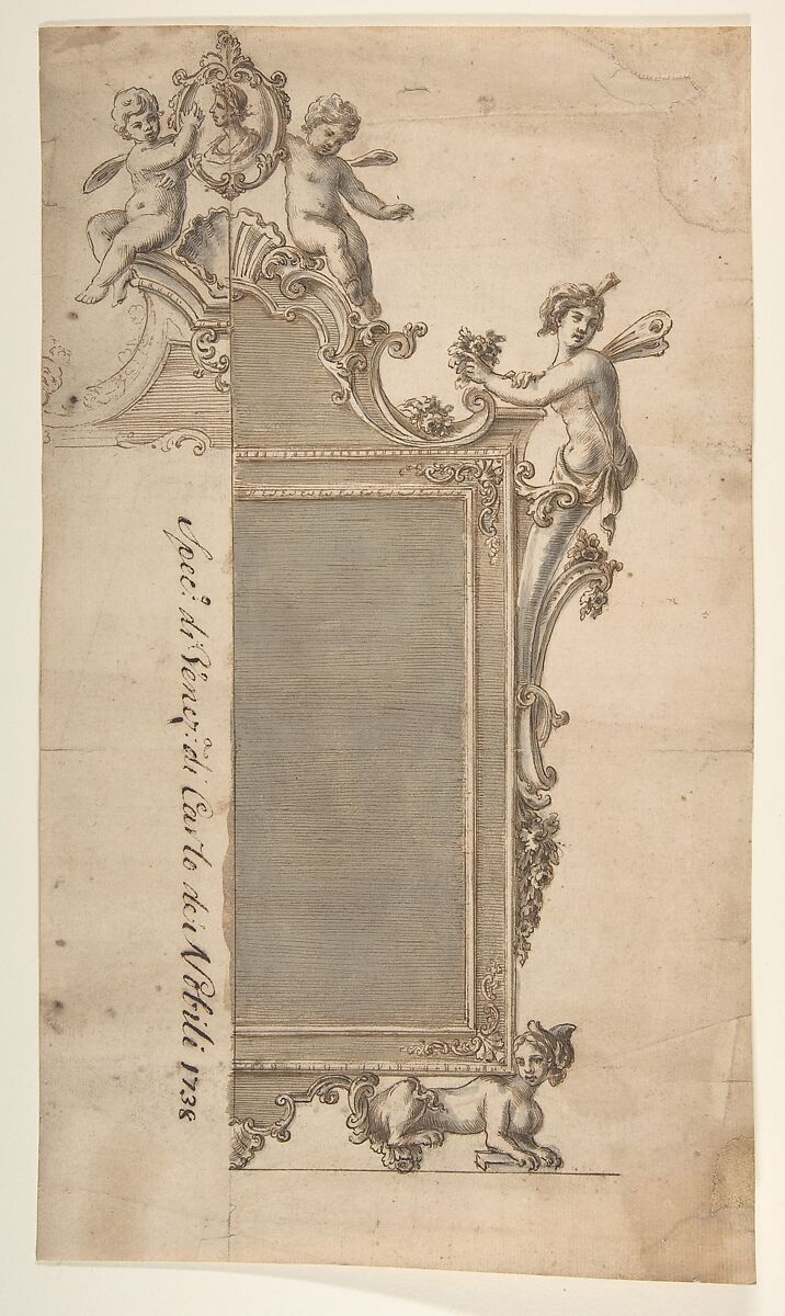 This beautiful design for a mirror was made by the Italian artist Giovanni Battista Natali III. He has drawn one half of the mirror in full detail, and only suggested certain details for the other half where changes to the design could be considered. The mirror is rendered in a late Baroque style, which places it relatively early in Natali’s career. His later designs show the emergence of the new Rococo style which culminates in his involvement in the production of the so-called Salottino di Porcellana (Small Porcelain Room) for the Queen of Naples, Maria Amalia of Saxony. Not much is known about Natali’s career, which can partly be credited to the fact that he was active in various art disciplines in different cities throughout Italy, making it difficult to trace his oeuvre. He was, moreover, also involved in the production of artworks of an ephemeral nature, such as set pieces for festivals and the theater which were usually destroyed after they had served their purpose. The 18th-century Italian inscription on this sheet attributes its design to the Venetian artist Carlo de’ Nobili, demonstrating that even though in this case the work of art has survived, its author was forgotten relatively soon after its creation.