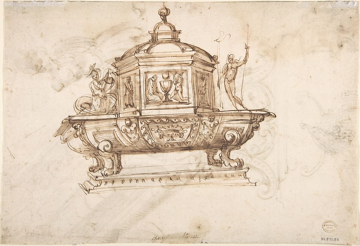 - Title:Design for a Liturgical Object with Statues of a Kneeling Saint and the Risen Christ (recto); Design for a Sepulcher (?) and Drawing of a Putto (verso)