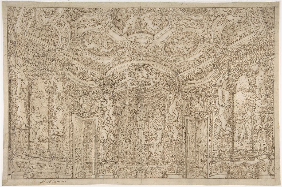 - Title: Design for a Stage Set of a Palace Interior Decorated with Putti, Garlands and Three Portrait Medallions