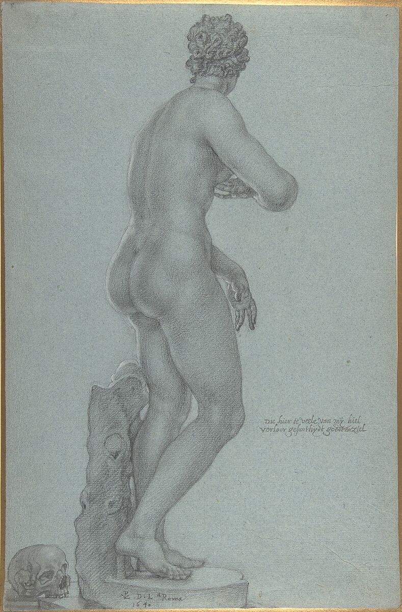 - Medium: Black chalk, brush and gray wash, heightened with white, on blue paper