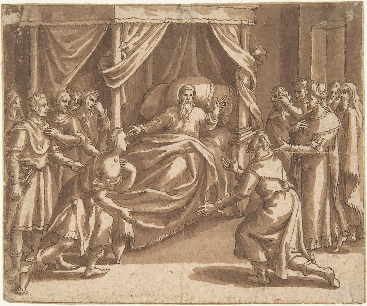 - Medium: Pen and brown ink, brush and brown wash. Framing lines in pen and brown ink. Indented for transfer
