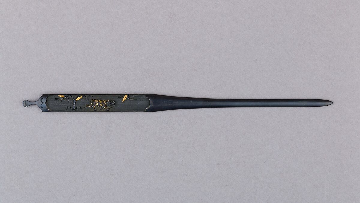 A kōgai is a hairdressing tool that is part of a sword mounting. The long slender implement is carried in a slot on the obverse of a katana scabbard, often with a matching kozuka (handle of a by-knife) in a slot on the reverse.