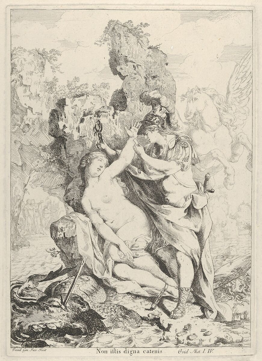 David depicts the moment when having slain the sea monster to whom she was to be sacrificed Perseus frees Andromeda. On the ground to the right of Perseus lies the shield whose reflective surface had enabled him to slay Medusa, since looking on the Gorgon directly would have turned him to stone. Although classical sources describe Perseus as flying with the aid of winged sandals, artists often show him riding Pegasus, born from Medusa's blood. Considered an embodiment of fame, the winged horse was an appropriate mount for a hero.