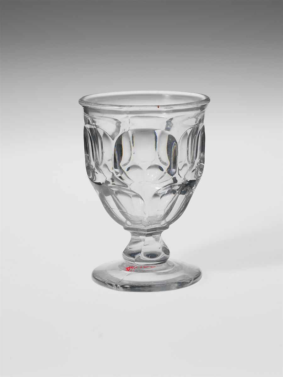 With the development of new formulas and techniques, glass-pressing technology had improved markedly by the late 1840s. By this time, pressed tablewares were being produced in large matching sets and innumerable forms. During the mid-1850s, colorless glass and simple geometric patterns dominated. Catering to the demand for moderately-priced dining wares, the glass industry in the United States expanded widely, and numerous factories supplied less expensive pressed glassware to the growing market. At the Exhibition of the Industry of All Nations at New York’s Crystal Palace in 1853, for example, the New England Glass Company exhibited 130 pieces of one design, "consisting of bowls, tumblers, champagnes, wines, and jelly glasses." This object belongs to one such service. Although the glass manufactory is not known, the glassware is very typical of the large services that were very popular with America’s middle class in the nineteenth century.