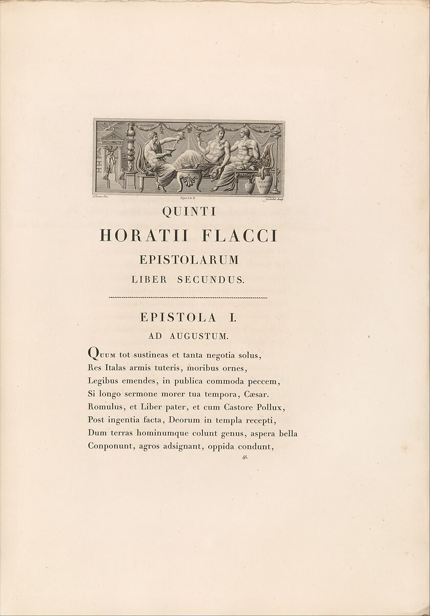 This is the second book in Didot's five-part project known as the "Louvre editions" (1798–1816). Situated between The Works of Virgil and The Works of Racine, it marked the pivotal transition in Didot's suite between authors from antiquity and those from modern France. The twelve headpiece illustrations were designed by Charles Percier, who also designed the headpieces in the penultimate installment of Didot's project, La Fontaine's Fables.