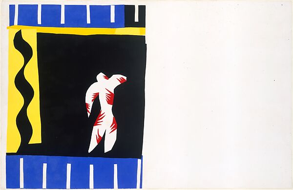 While titles connote specific activities, places, and myths, the images contain multiple references and transcend specific narratives. Monsieur Loyal, for instance, is linked to both the circus (the term means "ring master" in French and the figure, when turned upside down, looks like that of The Sword Swallower, another circus-themed print in Jazz) and the Free France leader General Charles de Gaulle, while The Wolf evokes both the villain from Little Red Riding Hood and Hitler. Icarus has multiple connotations, including a trapeze artist in a circus, the Greek myth, and perhaps Matisse himself. It also recalls a figure who has been killed, either through gunshot (symbolized by the red circle on his chest) or bombs (represented by the jagged yellow forms that surround him), a thought reflected in the comments of the Surrealist writer Louis Aragon, who described the figure in the cut-out The Fall of Icarus, on which the print is based as being "like a corpse, and, from what Matisse said himself, it seems that the splashes of yellow—suns or stars if you want to be mythological—were exploding shells in 1943." Similarly, the red plant-like forms on the figure in The Clown read as both decoration and scars or wounds. Despite its ostensible joyfulness, the threat of danger and death pervades the work, as seen in images such as Pierrot’s Funeral (perhaps a reference to Matisse’s own brush with death), The Knife Thrower, and The Sword Swallower, in addition to Icarus. The Cowboy; The Horse, Rider and Clown, and The Nightmare of the White Elephant convey a sense of confinement, captivity, anguish, and brutality through the undulating whips and lassos and the jagged red forms that seem to pierce the body of the elephant, who precariously balances on a small ball. In multiple prints, such as Icarus, The Clown, The Swimmer in the Tank and Toboggan, figures appear as if they are moving through space, perhaps even in a fatal fall.