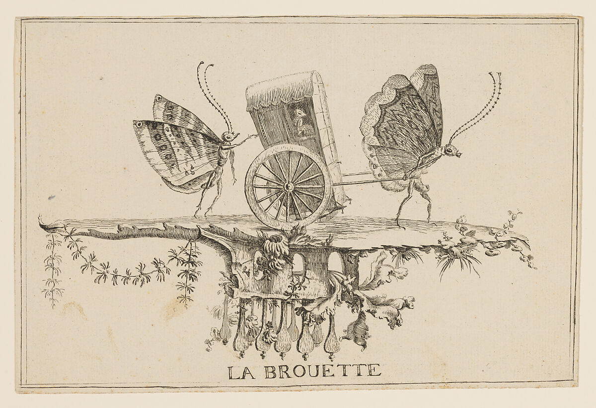 Butterflies masquerade as bath-chair attendants in this delicate vignette designed and etched by Saint-Aubin. A leading eighteenth-century designer of fabric and embroidery patterns, the artist also produced two sets of prints in which insects assume human roles. Intended as witty satires, their tone derives from the recently coined French verb papillonner, which means to act in a lighthearted or impulsive way.