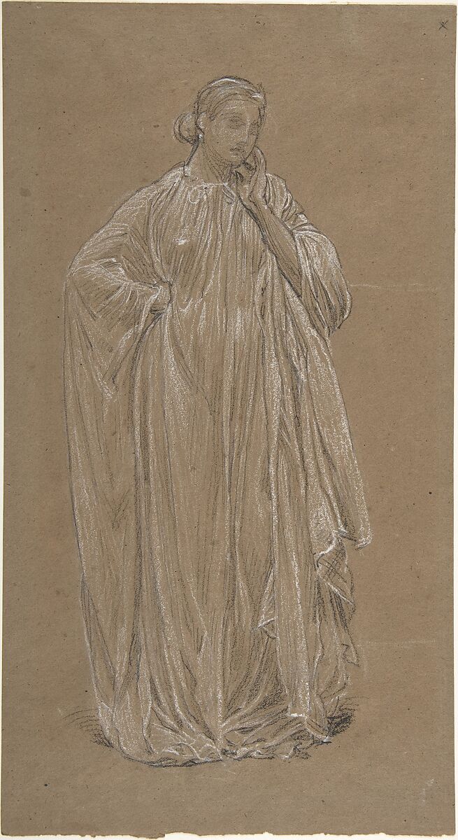 This drawing of a woman in classical robes likely was made in preparation for a fresco that Moore executed in 1866 at Claremont, a Georgian house near Salford, outside Manchester. Now lost, the painting was one of three overdoors in the octagonal hall and showed four women drawing water from a fountain. The model's pose, with a hand on her hip and the other at her chin, is one of waiting. The artist made numerous nude and draped studies for the commission; in the present sheet he focused on the model's voluminous translucent draperies. He used black and white chalk to capture shadows and highlights against the brown middle tone of the paper. Moore's decorative approach to classical subjects is characteristic of the Aesthetic Movement and influenced James McNeill Whistler, who began to make similar pastel studies on brown paper about this time.