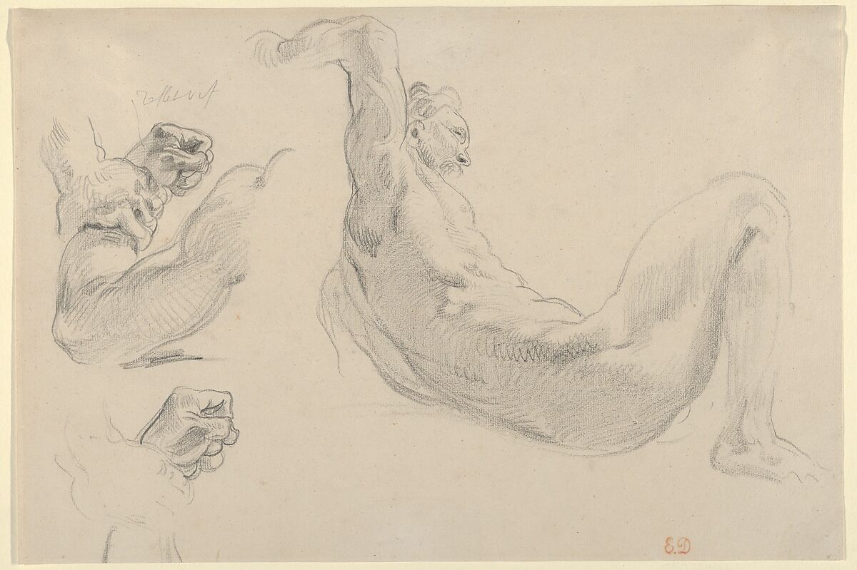 This drawing attests to an unrealized idea for an 1852 commission: the decoration of the Salon de la Paix in the newly expanded Hôtel de Ville (Paris City Hall). Delacroix’s program included eleven lunettes dedicated to episodes from the life of the Greek hero Hercules. Although conceived as a liberating act, Hercules feeding the barbaric king Diomedes to his own flesh-eating horses—the subject partially depicted here—was likely deemed too violent for a room dedicated to peace. The studies of Diomedes reaching backward above his head and Hercules’s fist clamped around the king’s arm convey some of the force of the struggle, even in the absence of Hercules’s body and the threatening horses.