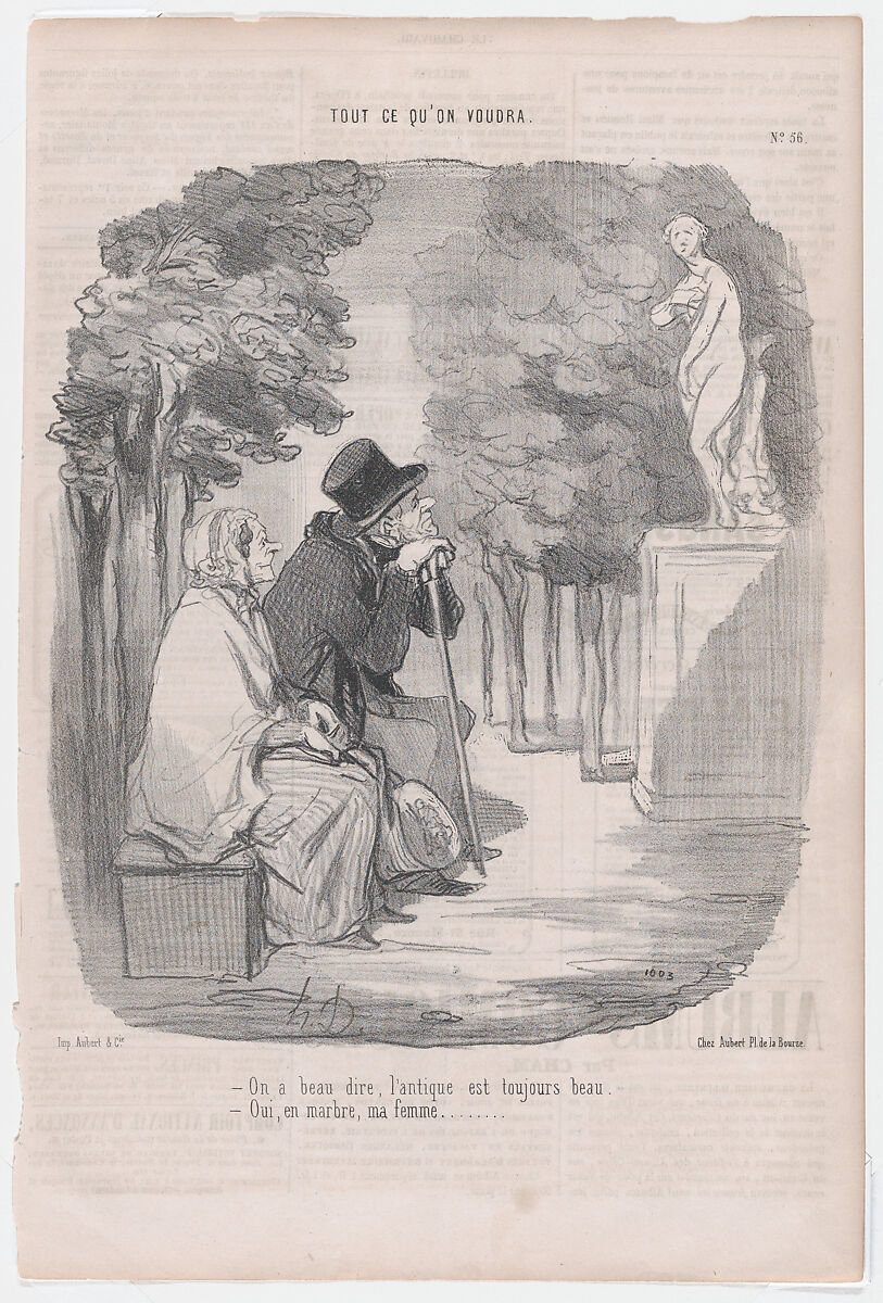 - Title: --No matter what one says, old things are always beautiful. --Yes, my dear, but only in marble., from 'As you like it,' published in Le Charivari, January 21, 1850