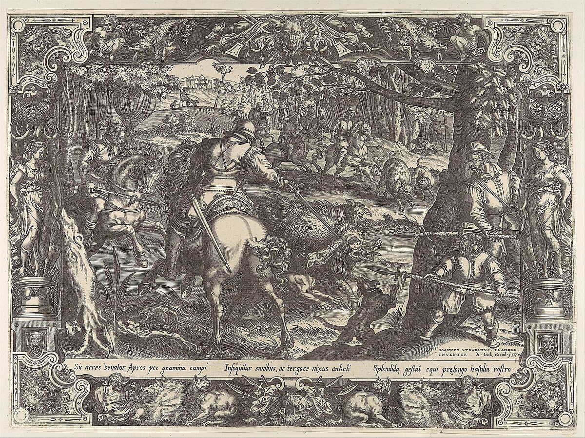 This engraving of a wild boar hunt is based on one of a series of six tapestry designs that Stradanus made for the Florentine Duke Cosimo I de’ Medici’s villa in Poggio a Caiano. In addition to this series, Stradanus made enough cartoons, or full-scale preparatory drawings, to decorate twenty rooms in the villa. Hunting boar was an activity limited to the aristocracy, and here we see the members of Cosimo’s court mounted on horseback, assisted by various servants on foot. A second engraving from the series shows the hunters catching the boars in nets.