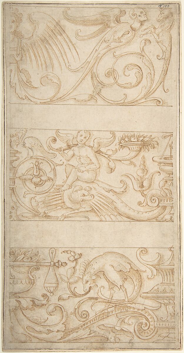 - Title: Antique-Style Ornamental Frieze Designs: Grotesques with Winged Infant, Masks, and Fantastic Animals