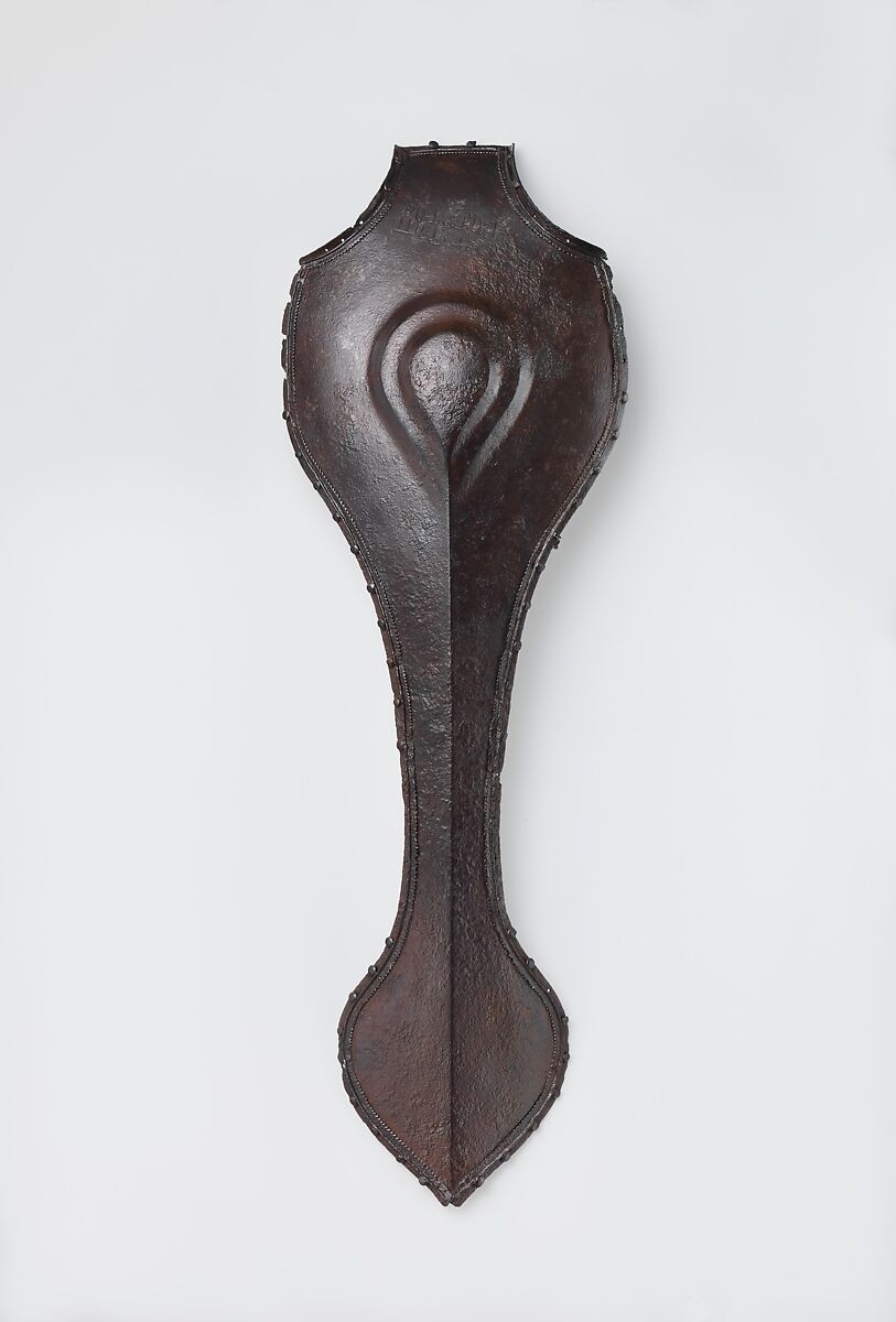 Horse armor was used widely in India. It was usually made from a combination of iron, textile, and leather, the centerpiece of which was an iron shaffron such as this one, which protected the front of a horse's head from the muzzle to the ears. In addition to the date, the Arabic inscription seen near the top edge of this shaffron includes the name of Sultan Muhammad Qutb Shah, ruler of the kingdom of Golconda in southern India from 1612 to 1626. Very few pieces of Indian horse armor can be dated so closely, or associated with a specific ruler, making this example extremely rare and important.