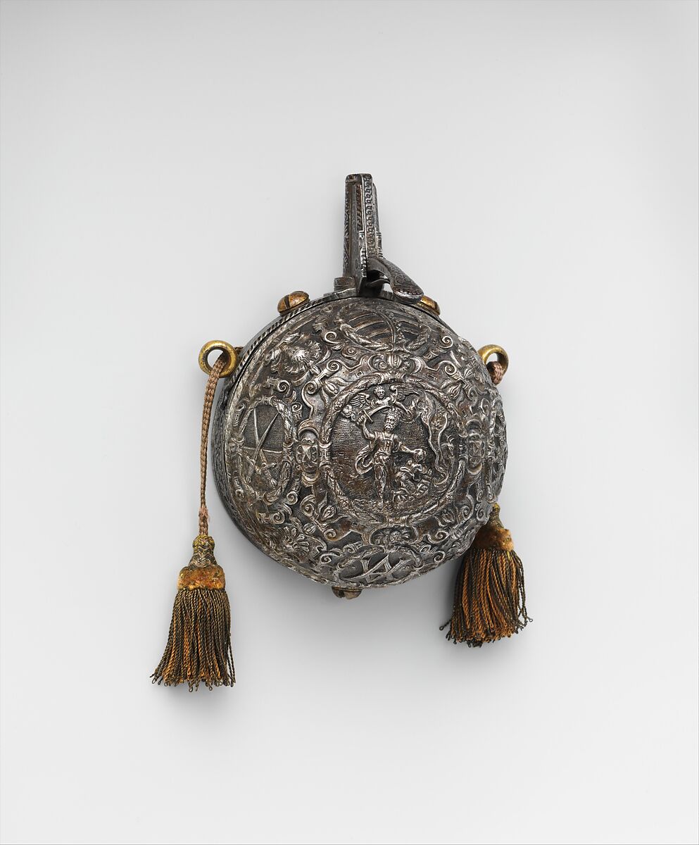 This finely worked flask is chiseled with the arms of Saxony and Denmark, and the monogram AA for August I of Saxony and his wife Anna of Denmark. In the center is a depiction of the Sacrifice of Isaac, a story from the Old Testament. The flask was seized by the Nazis from the collection of Baron Alphonse Mayer Rothschild (1878–1942) in Vienna in 1938 and restituted by the government of Austria to his heirs in 1949.